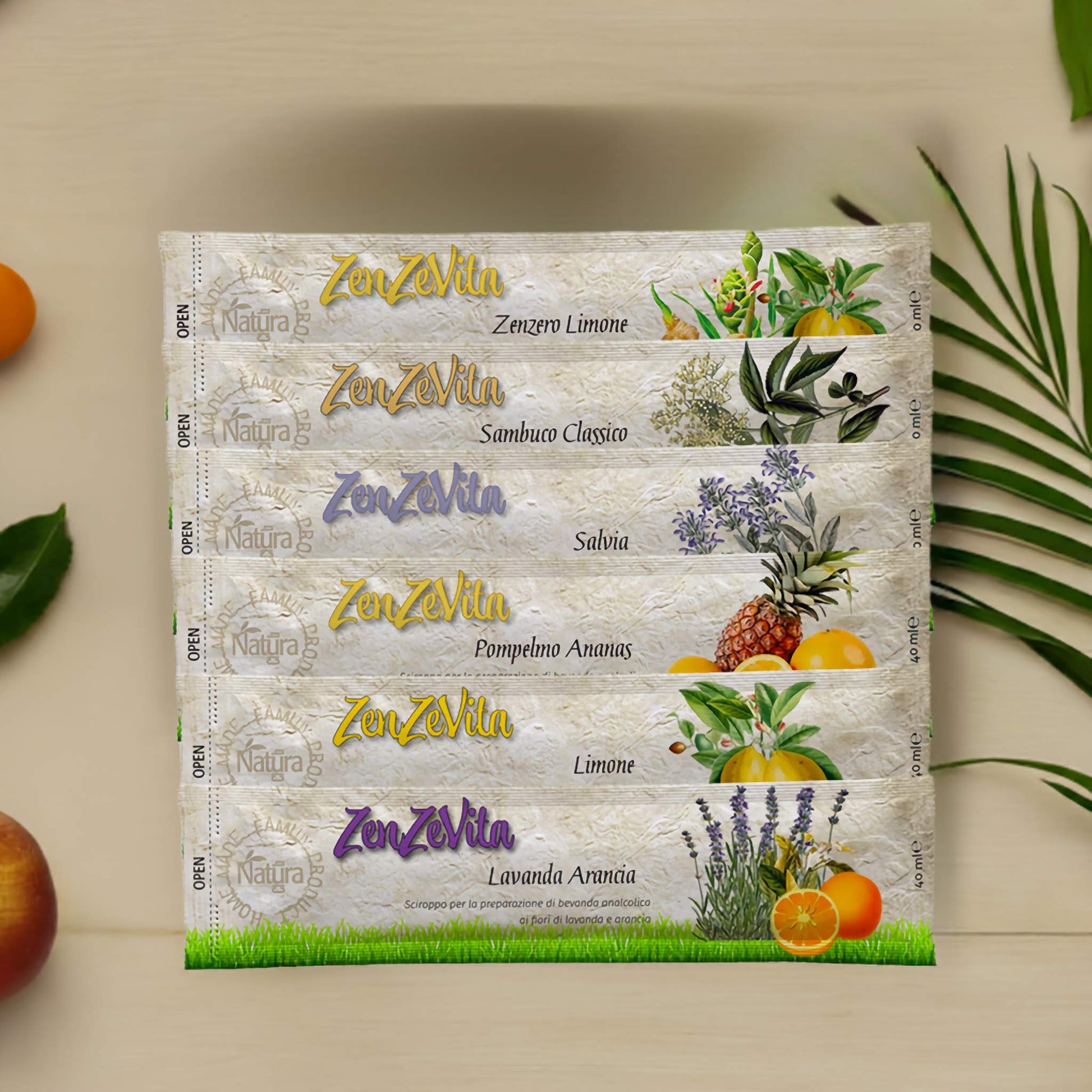 Provali tutti e 6 i gusti, Il nostro primo gusto è lo Zenzero Limone, una combinazione unica di spezie calde e agrumi freschi che ti farà sentire come se fossi in vacanza.Il secondo gusto è la Lavanda e arancia, una bevanda rilassante che ti farà sentire come se fossi in un giardino fiorito.Il terzo gusto è il Pompelmo Ananas, una bevanda tropicale perfetta per un giorno caldo d'estate.Il quarto gusto è i Fiori di Sambuco classico, una bevanda delicata e raffinata perfetta per una serata romantica, il gusto limone ottimo per rinfrescarsi e Infine il sesto gusto è la Salvia, una bevanda unica e originale perfetta per chi ama sperimentare nuovi sapori, scopri il tuo preferito!