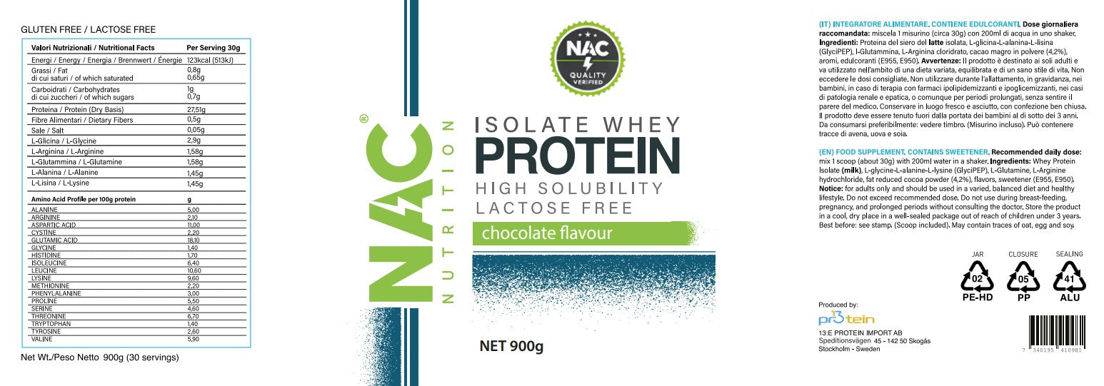 NAC Nutrition Isolate Whey Protein (WPI). Proteine isolate del siero del latte ad altissima purezza (>90% proteine).